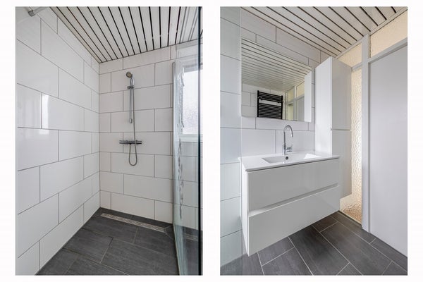 Overloop met trapopgang naar de tweede verdieping. Slaapkamer 1 aan de voorzijde met 2 dakramen. Badkamer voorzien van wastafel, inloopdouche en verwarmingselement. Tweede ruime slaapkamer aan de achterzijde en voorzien van inloopkast.