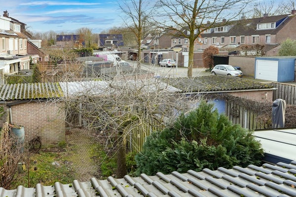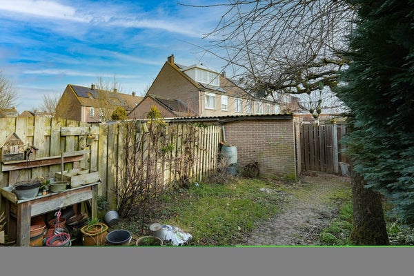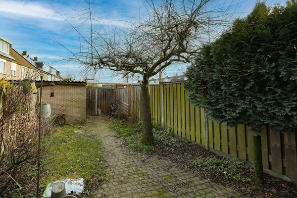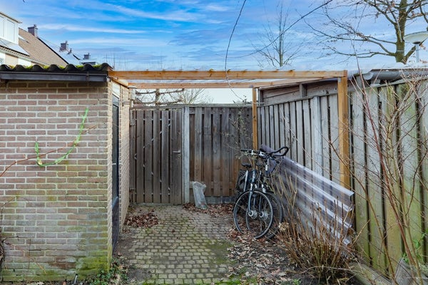 De achtertuin ligt op het noordoosten en is een combinatie van bestrating en groen. De tuin is deels bestraat, waardoor er volop ruimte is voor een gezellig terras, en deels groen aangelegd voor een natuurlijke uitstraling. Achterin bevindt zich een vrijstaande stenen berging, ideaal voor extra opslag, en dankzij de eigen achterom is de tuin ook zeer praktisch bereikbaar — perfect voor het stallen van fietsen.