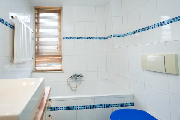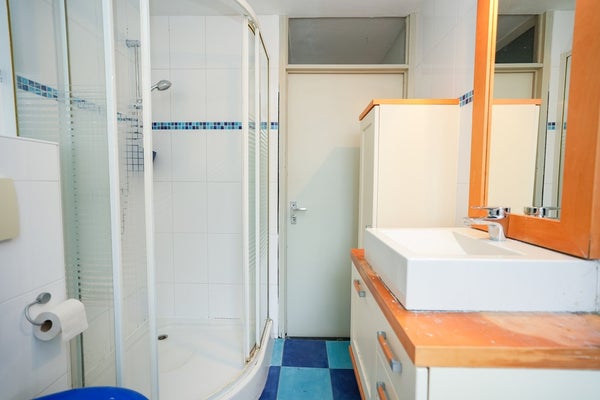 De badkamer is compleet uitgevoerd en beschikt over een toilet, douchecabine, ligbad en een wastafelmeubel met spiegel. Op de overloop bevindt zich bovendien een praktische inbouwkast – ideaal voor het netjes opbergen van linnengoed, kleding of andere spullen.