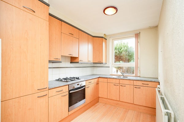 De keuken is gesitueerd aan de voorzijde van de woning en geniet van prettig veel lichtinval. De keuken is eenvoudig uitgevoerd, maar functioneel ingericht en voorzien van diverse inbouwapparatuur. Een fijne, lichte ruimte waar u met gemak een eigentijdse droomkeuken kunt realiseren.