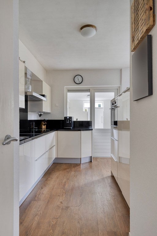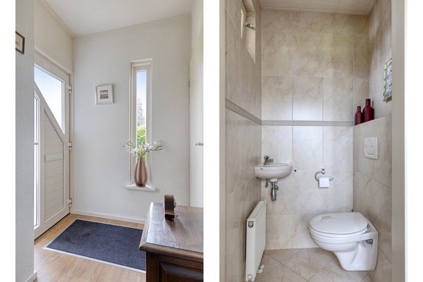 Betreedt de woning via een royale en lichte hal met toilet, meterkast, bergkast en trapopgang. Vanuit hier komt u in de doorzonwoonkamer met aan de voorzijde een lichte zithoek dankzij de grote raampartijen. Centraal in de woning bevindt zich een sfeervolle houtkachel. De woonkamer loopt naadloos over in de eethoek met aansluitend de open keuken. Tussen de eethoek en keuken is momenteel een afscheiding geplaatst, die eenvoudig te verwijderen is. De nette keuken is voorzien van een inductiekookplaat, combi-oven (2022), koelkast, vaatwasser en afzuigkap. Aansluitend bevindt zich een praktische bijkeuken.