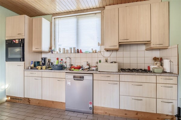 Keuken, 7 m², v.v. plavuizen, 4-pits gaskookplaat, afzuigkap, oven en vaatwasser.