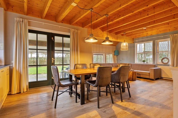 De ruimte woonkamer met keuken is fraai en sfeervol ingericht met voldoende zitplaatsen. Via de tuindeuren loopt u zo het overdekt terras op waar u kunt genieten in de ruime tuin.