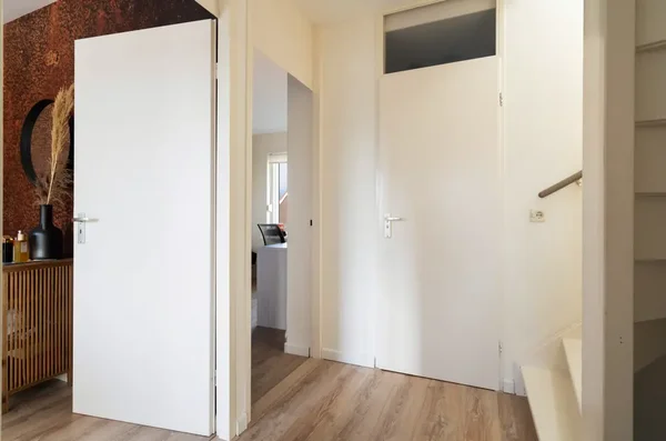 Je komt binnen in de hal met meterkast, toilet en trap naar boven. De verrassend ruime, uitgebouwde woonkamer ligt aan de tuinzijde en is voorzien van een zwevende PVC -vloer met daaronder een massief houten vloer en een praktische provisiekast. Dankzij de openslaande deuren verleng je de woonkamer op zonnige dagen moeiteloos naar buiten.