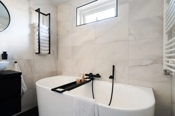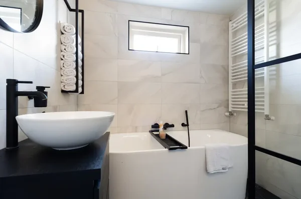 De badkamer (2022) is compleet uitgerust met een tweede toilet, ruim ligbad, inloop regen-douche en wastafelmeubel met waskom.