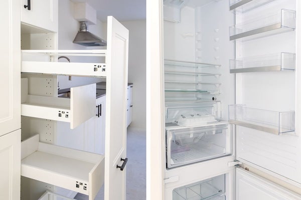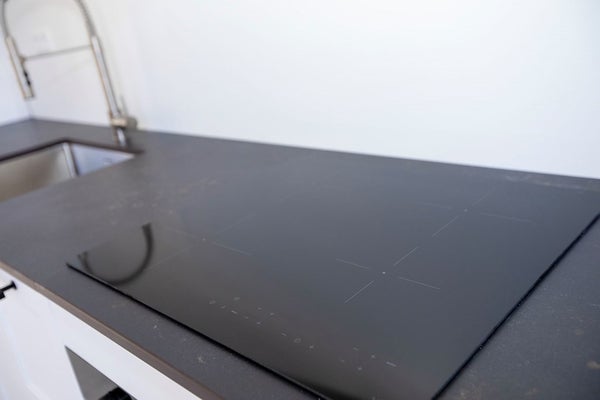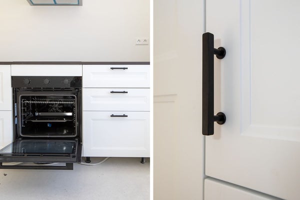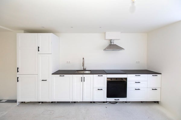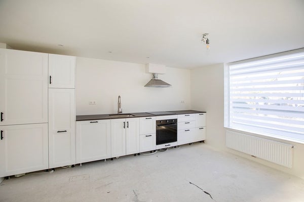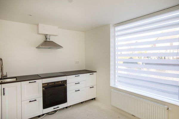 Aan de voorzijde van de woning bevindt zich de open, lichte inbouwkeuken in moderne stijl, uitgerust met diverse inbouwapparatuur, waaronder een elektrische kookplaat, oven, koelkast, vriezer, vaatwasser en afzuigkap — ideaal voor kookliefhebbers die ook tijdens het koken contact willen houden met de woonkamer.