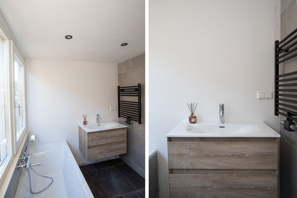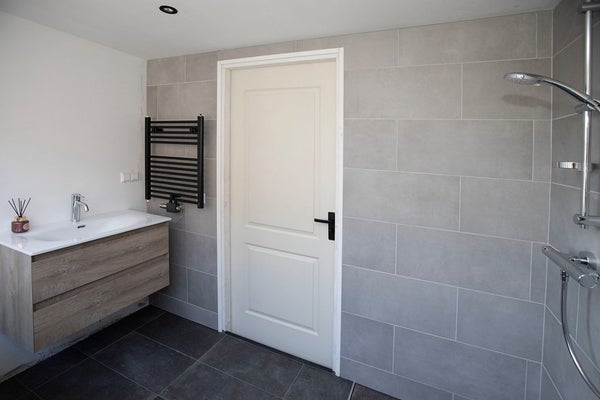De moderne badkamer is compleet uitgevoerd en voorzien van een kunsstof ligbad, inloopdouche, tweede toilet en een wastafelmeubel.