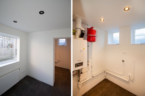 Aan de achterzijde van de woning ligt de werkkamer met een toegangsdeur naar de tuin. Aansluitend aan deze ruimte bevindt zich de technische ruimte met aansluitingen voor wasmachine en droger, evenals de opstelling van de centrale verwarmingsketel.