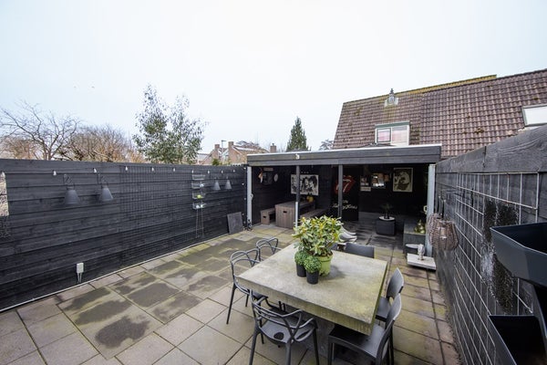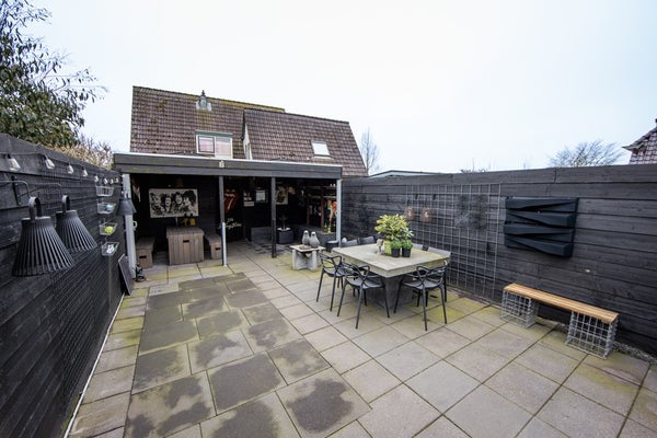 De achtertuin ligt lekker zonnig op het zuiden en is 10 meter diep. Met een achterom en een vrijstaande houten schuur met overkapping en 12 zonnepanelen.