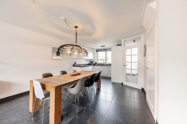 De moderne halfopen keuken heeft inbouwapparatuur. De natuurstenen vloer heeft vloerverwarming, is extra geïsoleerd en er zijn openslaande deuren naar de tuin.