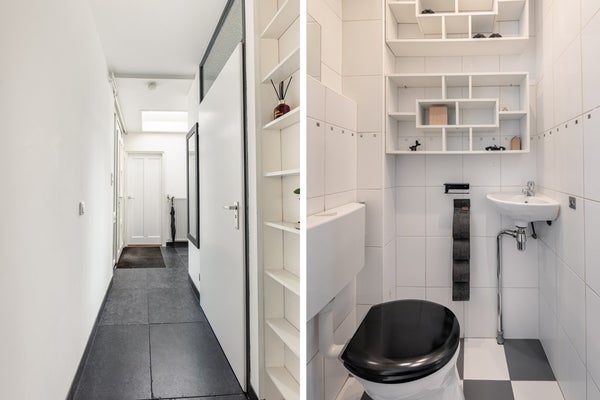 De hal met toilet biedt toegang tot een werkkamer en de woonkamer. Wat gelijk opvalt, is dat de interne berging bij de woonkamer is getrokken en de uitbouw met serre aan de achterzijde. Daardoor is er een enorme klap ruimte bijgekomen.