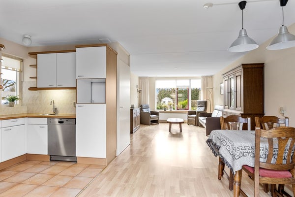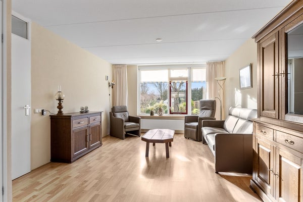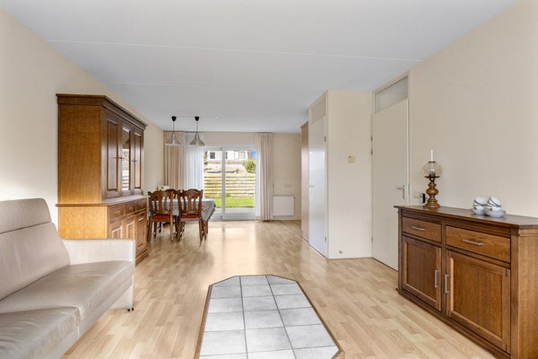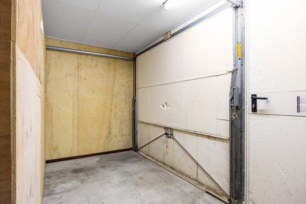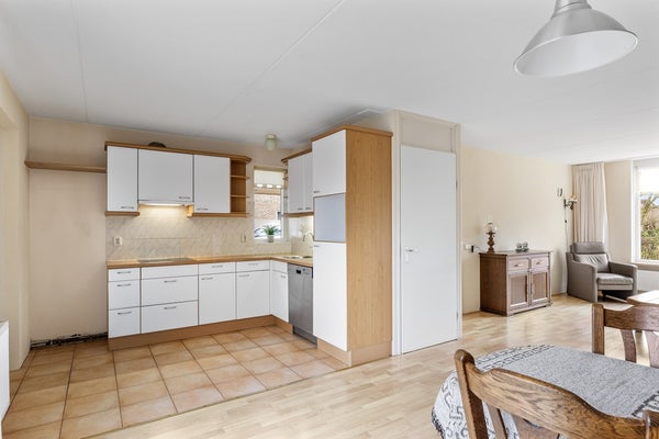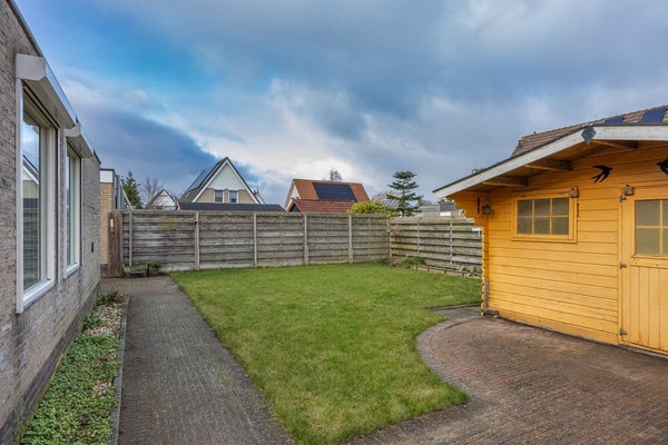 Entree, hal, meterkast, trapopgang, toilet. De ruime woonkamer heeft veel lichtinval en een schuifpui aan de achterzijde. Vanuit de woonkamer is er een mooi uitzicht over de straat en het tegenover de woning gelegen grasland. De hoekkeuken is voorzien van inbouwappratuur en heeft voldoende bergruimte. In de uitpandige bijkeuken bevinden zich de cv-opstelling, een uitstortgootsteen en een achterdeur naar de tuin. In het achterste gedeelte van de bijkeuken is een badkamer gerealiseerd met douche en wastafelmeubel. Vanuit de bijkeuken is er toegang naar de voormalige garage. Deze garage is verbouwd in een tussengang, een slaapkamer en een berging. De slaapkamer kijkt uit op de achtertuin en heeft een vaste kast. In de gang is plaats voor witgoedaansluitingen. Het voorste gedeelte van de garage is nu berging met een loopdeur naar de oprit. Een royale carport biedt ruimte voor uw auto. Via de zijkant is er een achterom naar de beschutte achtertuin. Deze tuin ligt op het noordoosten en is voorzien van een houten bergschuur.