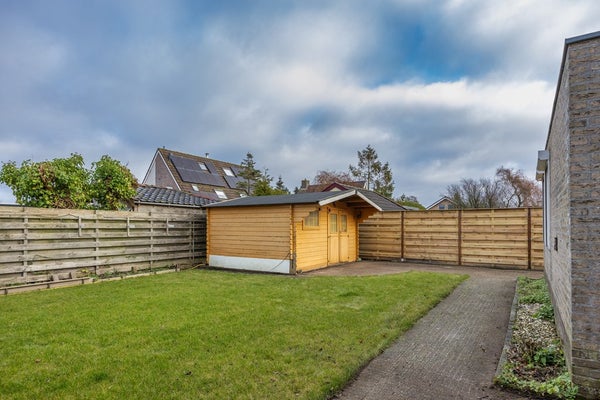 De beschutte achtertuin is aan gelegd met bestrating, gazon en een houten bergschuur. De onderhoudsvriendelijke voortuin beschikt over een grindgedeelte met verhoogde plantenborder. De oprit biedt parkeerruimte voor meerdere auto's en is voorzien van een royale carport.
