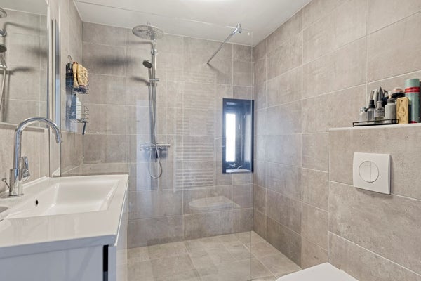 De eerste verdieping beschikt over een overloop met bergruimte en toegang tot vijf ruime slaapkamers. Alle slaapkamers zijn voorzien van een laminaatvloer. Vier slaapkamers zijn uitgerust met airconditioning, wat zorgt voor extra comfort in warme periodes. De badkamer is netjes afgewerkt en voorzien van een grote inloopdouche, wastafel met meubel, toilet en designradiator.