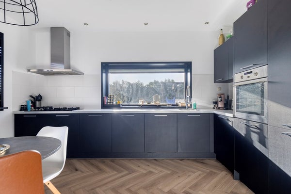 De open woonkeuken is uitgevoerd in een hoekopstelling en voorzien van diverse inbouwapparatuur, waaronder een oven, 5-pits gasfornuis, afzuigkap, vaatwasser, koelkast en vriezer. Via de kelderkast is de kelder bereikbaar, met een oppervlakte van circa 12 m², geschikt voor opslag of provisie.