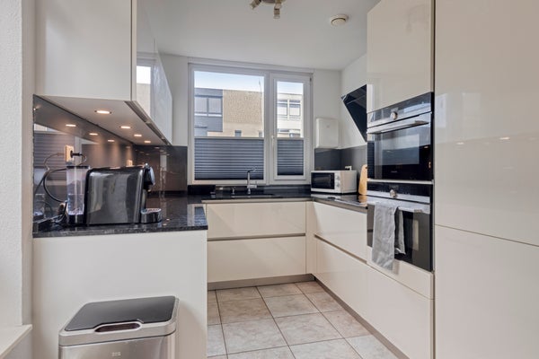 Aan de voorzijde van de woning bevindt zich de moderne keuken met een praktische U-vormige opstelling. De keuken is uitgerust met een inductiekookplaat met afzuigkap, spoelbak, vaatwasmachine, koelkast en een ingebouwde ovencombinatie. Dankzij de vele lades en kastjes beschikt u over ruime opbergmogelijkheden. De moderne afwerking maakt dit een prettige en functionele ruimte waar koken een plezier wordt.