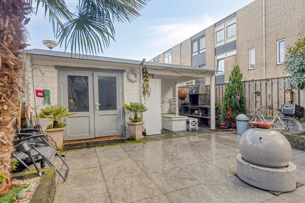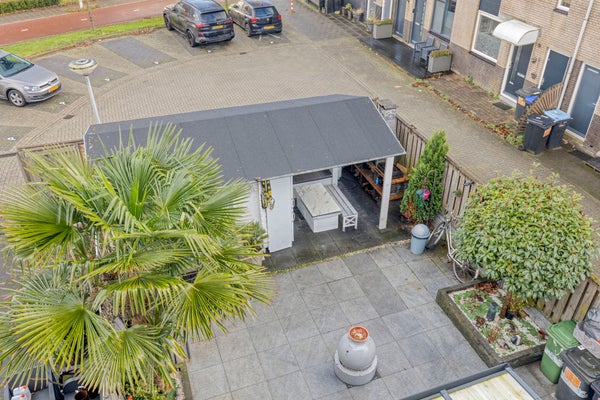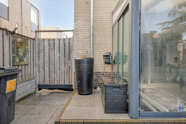 De zonnige achtertuin is verzorgd aangelegd en biedt een mooie combinatie van bestrating en groen. Onder de overkapping is ruimte voor een buitentafel, waardoor u ook bij minder weer comfortabel buiten kunt zitten. Daarnaast beschikt de tuin over een berging en een poort, wat zorgt voor extra gemak en praktische opbergruimte.