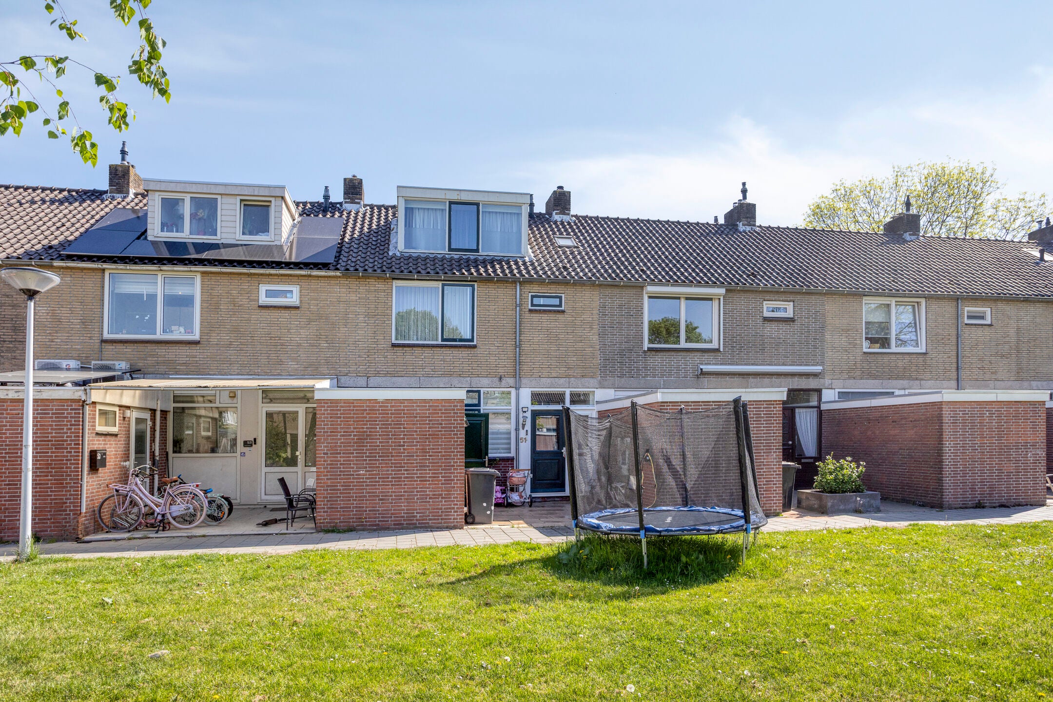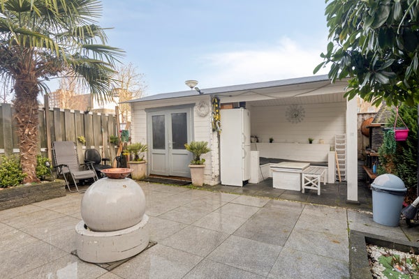 The sunny rear garden is neatly landscaped and offers a fine combination of paving and greenery. Under the canopy there is space for an outdoor dining table, allowing you to sit outside comfortably even in less favourable weather. In addition, the garden features a storage shed and a rear entrance, providing extra convenience and practical storage space.