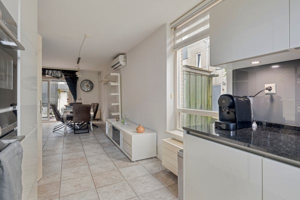 De woonkamer vormt het hart van de begane grond en is dankzij de open indeling heerlijk ruim en licht. Hier is volop plek voor een comfortabele zithoek én een gezellige eethoek, waardoor u moeiteloos kunt schakelen tussen ontspannen en samen tafelen. De tegelvloer geeft de ruimte een strakke uitstraling en de ingebouwde haard zorgt voor extra sfeer. De aanwezigheid van airconditioning verhoogt het wooncomfort, terwijl de directe verbinding met de serre de leefruimte op een natuurlijke manier vergroot.