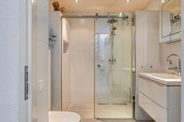 The neat and modern bathroom is also located on the first floor. It features a walk-in shower with sliding door, a wall-mounted toilet and a washbasin with mirror. The bathroom is finished in a sleek and well-maintained style and offers a pleasant space to start or end the day in a relaxed manner.