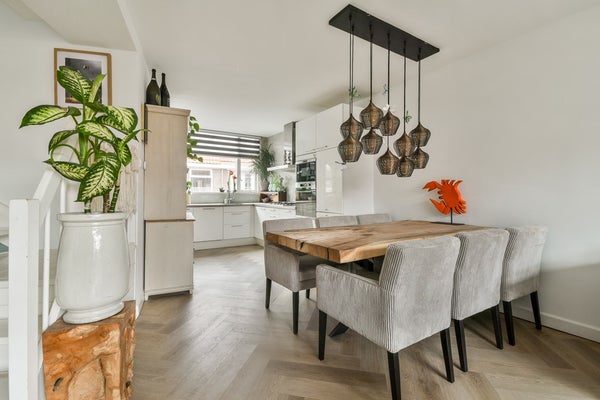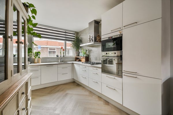 Dankzij de uitbouw van de begane grond is een royale, lichte woonkamer ontstaan die volledig is voorzien van vloerverwarming. Binnen en buiten lopen hier naadloos in elkaar over, waardoor een warme en uitnodigende leefruimte ontstaat waar u elke dag met plezier thuiskomt. De open keuken is smaakvol afgewerkt en compleet uitgerust met hoogwaardige inbouwapparatuur. Deze keuken is praktisch en groot genoeg voor iedereen die van koken houdt, terwijl de aangrenzende eethoek ideaal is voor gezellige diners en lange avonden met familie en vrienden. Via de openslaande deuren betreedt u de veranda en het terras, een natuurlijke verlenging van de woonkamer.