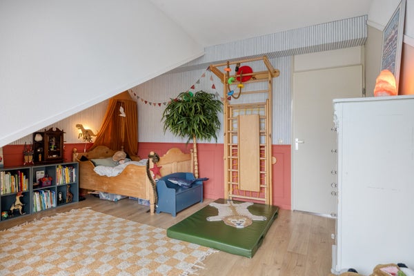 De zolder biedt de mogelijkheid om een ruime 4de slaapkamer te maken en er is veel opbergruimte onder de lange schuine kap. Hier bevindt zich ook de aansluiting van de wasmachine en droger. De ramen aan de achterzijde zijn voorzien van rolluiken.