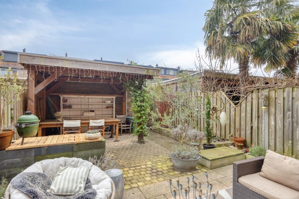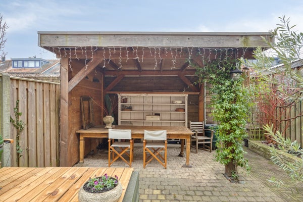 De ruime achtertuin is gelegen op het zuid/westen, en heeft een achterom. De tuin heeft een houten berging + overkapping.