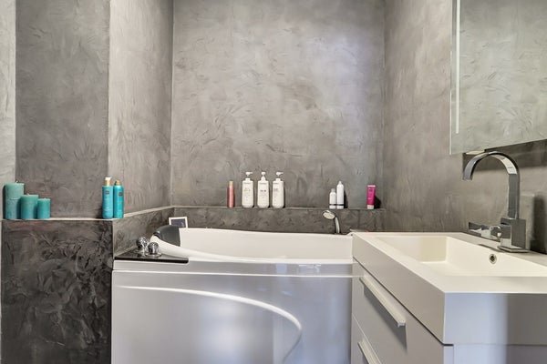 badkamer met ligbad en wastafel, een separaat toilet en een praktische bijkeuken