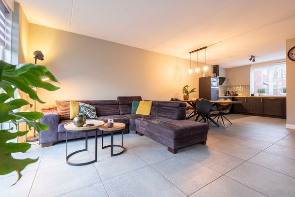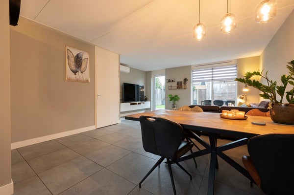 Stap binnen in de lichte hal met modern toilet en trapopgang. Vanuit de hal loop je direct door naar de comfortabele, fraai afgewerkte woonkamer. Grote raampartijen vangen volop daglicht en geven meteen een warm welkom. Zie je jezelf al zitten met een kop koffie aan de eettafel, of juist languit op de bank na een drukke dag? Zet de deur open naar de achtertuin en geniet van het buitenleven, terwijl je binnen profiteert van vloerverwarming. Handig: onder de trap verschuilt zich een handige voorraadkast, ideaal voor je voorraad, kinderspelletjes of andere spullen die je graag uit het zicht houdt.