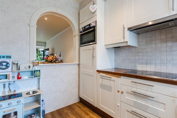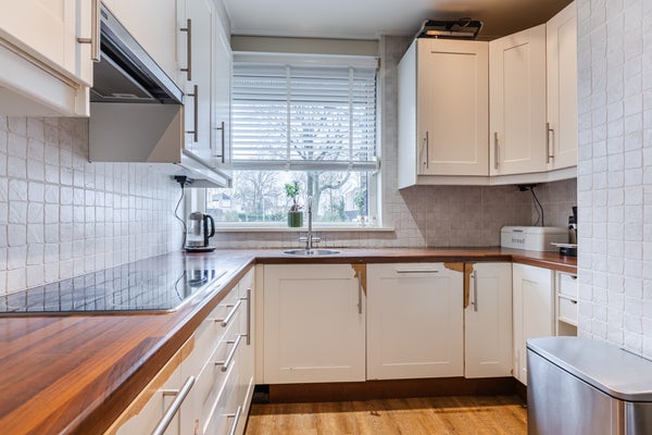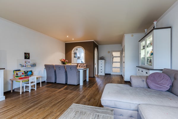 Bij binnenkomst kom je in een nette entree met toegang tot de praktische bijkeuken en de lichte woonkamer, voorzien van vloerverwarming en openslaande tuindeuren naar de veranda. De hoekkeuken is uitgerust met moderne inbouwapparatuur.