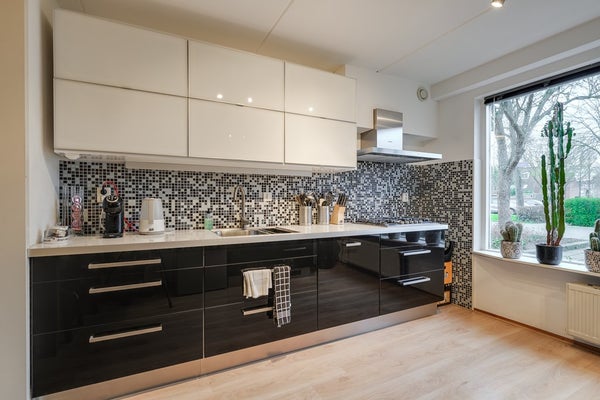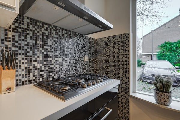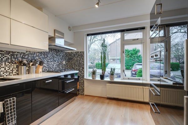 Aan de voorzijde ligt de keuken: strak, praktisch en compleet uitgevoerd met vaatwasser, combimagnetron en een 5-pits gasfornuis. Een fijne plek om te koken terwijl je uitkijkt op de rustige straat, met alles binnen handbereik.