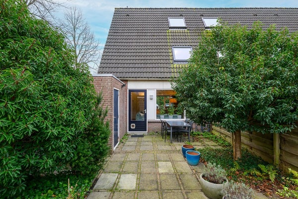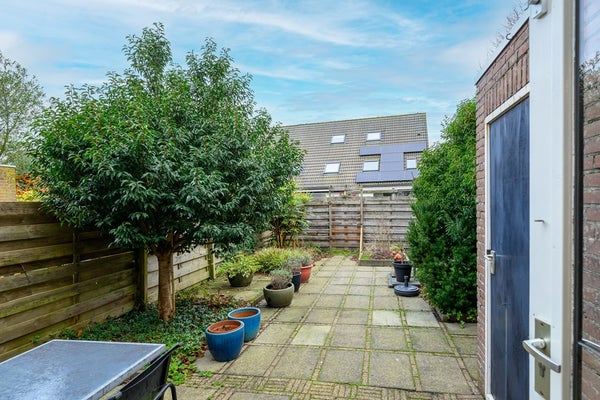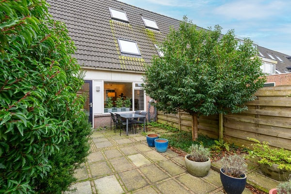 De achtertuin is verzorgd en beschut, een fijne plek om buiten te zitten, te eten of gewoon even niets te doen. Door de ligging is er een prettige balans tussen zon en schaduw.