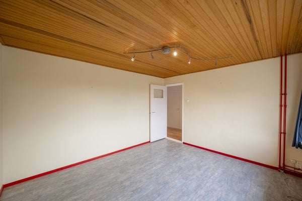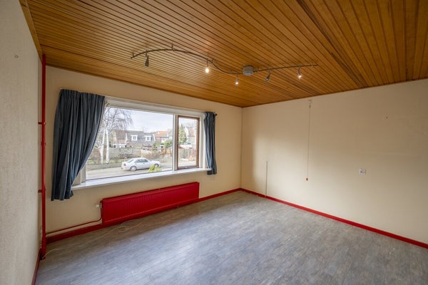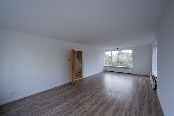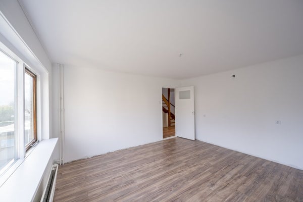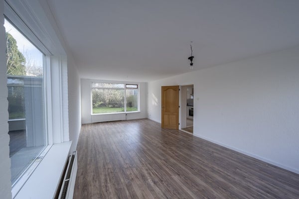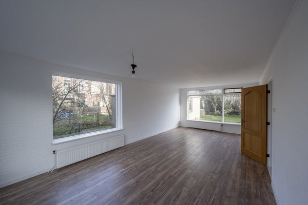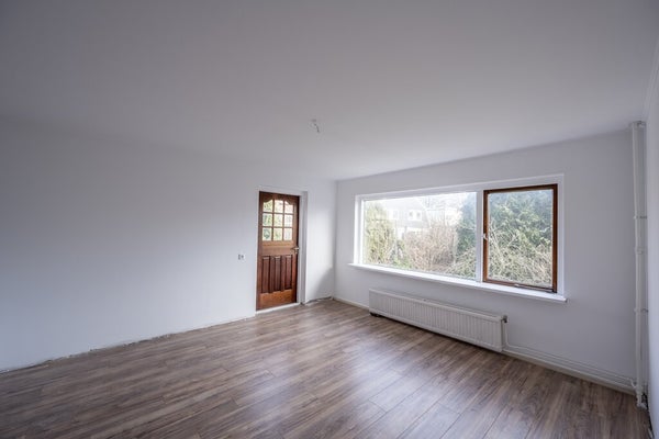 De woonkamer is een ruime doorzonkamer met grote raampartijen aan de voor- en achterzijde. Dankzij de hoekligging is er ook aan de zijkant een extra raam aanwezig, wat zorgt voor een prettige lichtinval. De ruimte is afgewerkt met een laminaatvloer en voorzien van dubbele beglazing. De wanden zijn netjes en strak afgewerkt, wat een verzorgde basis biedt om verder te moderniseren. Er is voldoende ruimte voor een royale zithoek en een eetgedeelte.