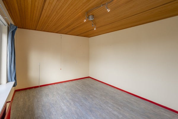 Aan de voorzijde bevindt zich een ruime slaapkamer met een grote raampartij en prettige lichtinval. Deze kamer is afgewerkt met een blauwe vinylvloer en voorzien van houten kozijnen met dubbele beglazing.