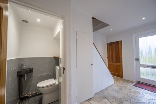 Via de ruime voortuin bereik je de entree van de woning. Je komt binnen in een royale hal met toegang tot de trapopgang naar de eerste verdieping, de keuken, de leefruimte, de meterkast, een praktische trapkast en het toilet.