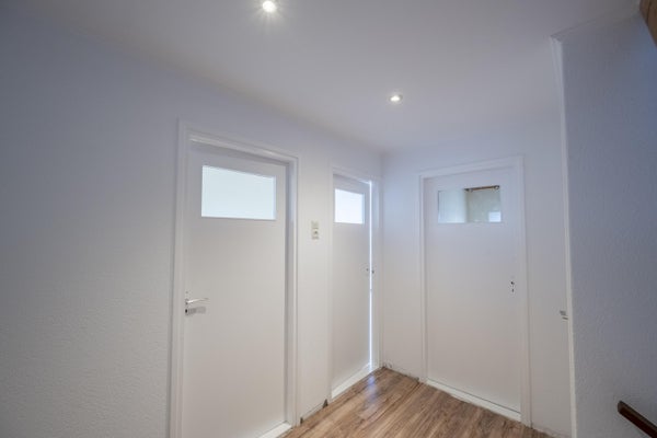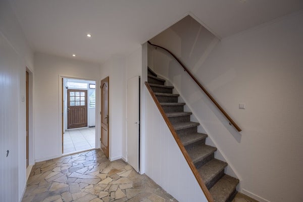 Via de vaste trap in de hal bereik je de eerste verdieping. De ruime overloop biedt toegang tot drie slaapkamers, de badkamer en een praktische inpandige kast.