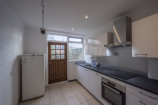 De keuken is momenteel een afgesloten ruimte en bevindt zich aan de achterzijde van de woning. De keuken is afgewerkt met een witte tegelvloer en hoogglans witte keukenfronten en voorzien van een oven, een 4-pits inductiekookplaat, een afzuigsysteem, een spoelbak en een vaatwasser. Via de achterdeur is er directe toegang tot de tuin. De indeling biedt mogelijkheden om de keuken bij de leefruimte te betrekken en zo een open woonruimte te creëren.