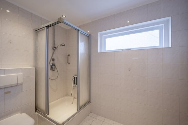 De badkamer is uitgevoerd met crèmekleurige tegels en beschikt over een douchecabine, een hangend toilet en een designradiator. Het plafond is afgewerkt met inbouwspots.