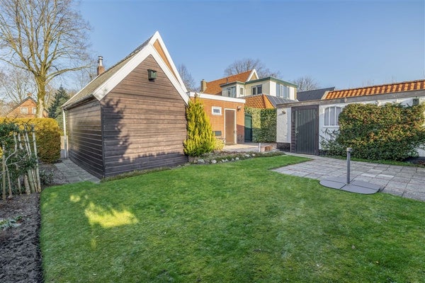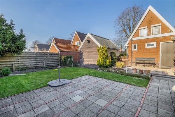 Ook buiten is het genieten. De tuin rondom biedt voor elk moment van de dag een fijne plek: een zonnige achtertuin op het zuiden met terras en grasveld, een zijtuin met oprit en parkeergelegenheid voor meerdere auto’s, en een verzorgde voortuin. Daarnaast zijn er een vrijstaande berging en een garage aanwezig.