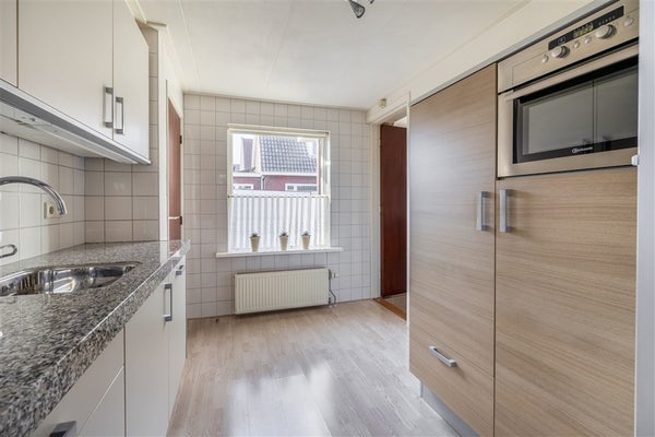 De keuken is praktisch ingericht en voorzien van een inbouwkeuken met natuurstenen werkblad en diverse inbouwapparatuur. Vanuit hier is er toegang tot de kelder, ideaal als provisieruimte. De bijkeuken biedt plaats aan witgoed en de cv-installatie.
