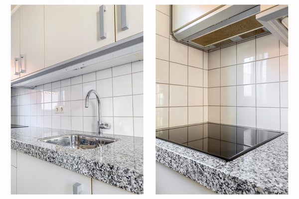 Keuken, 9.5 m², v.v. laminaatvloer en een inbouwkeuken met natuurstenen blad, spoelbak, inductiekookplaat, afzuigkap, vaatwasser, koeler en combi-magnetron/oven en toegang tot de kelder.