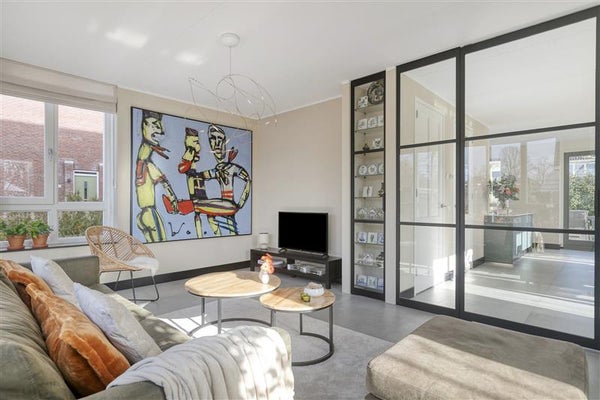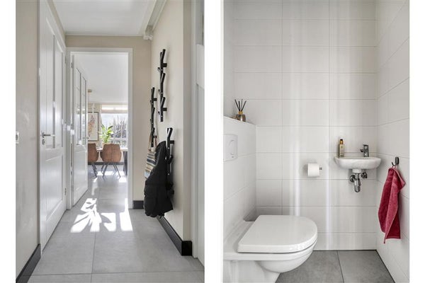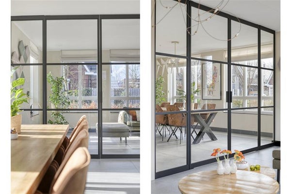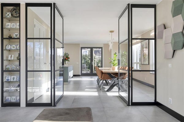 Stap binnen en ervaar de verfijnde sfeer die deze woning uitstraalt. De royale entree, compleet met een verzorgd toilet, verwelkomt je met een warme plavuizenvloer voorzien van vloerverwarming – een voorproefje van het comfort dat binnen op je wacht. Vanuit de entree leidt de ruimte naar een riante woonkamer en een aangrenzende eetkamer, die opvallend flexibel zijn dankzij de stalen taatsdeuren. Deze deuren bieden de mogelijkheid om de woonkamer en eetkamer eenvoudig af te sluiten, zodat je tijdens intieme etentjes, rustige TV-avonden of wanneer privacy gewenst is, in alle rust kunt genieten.