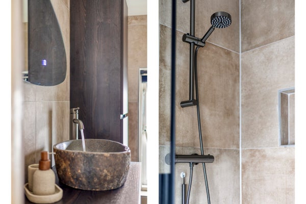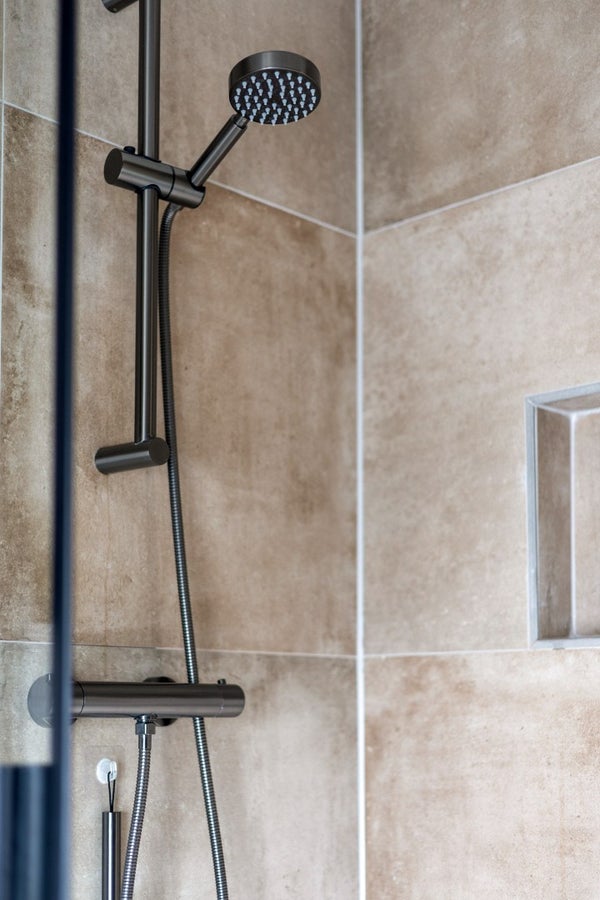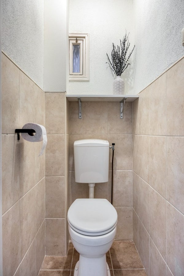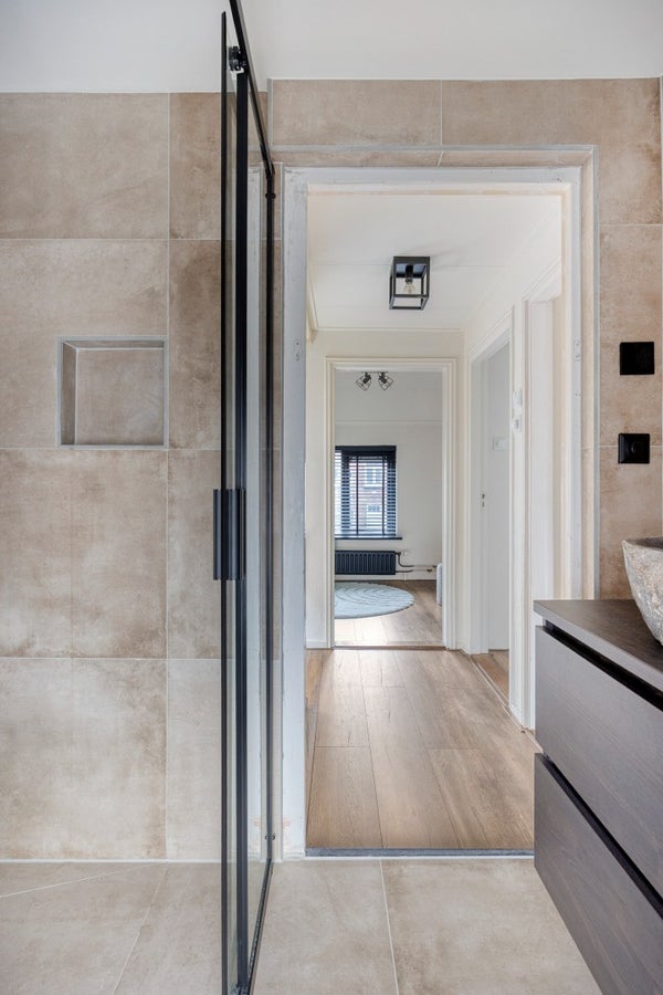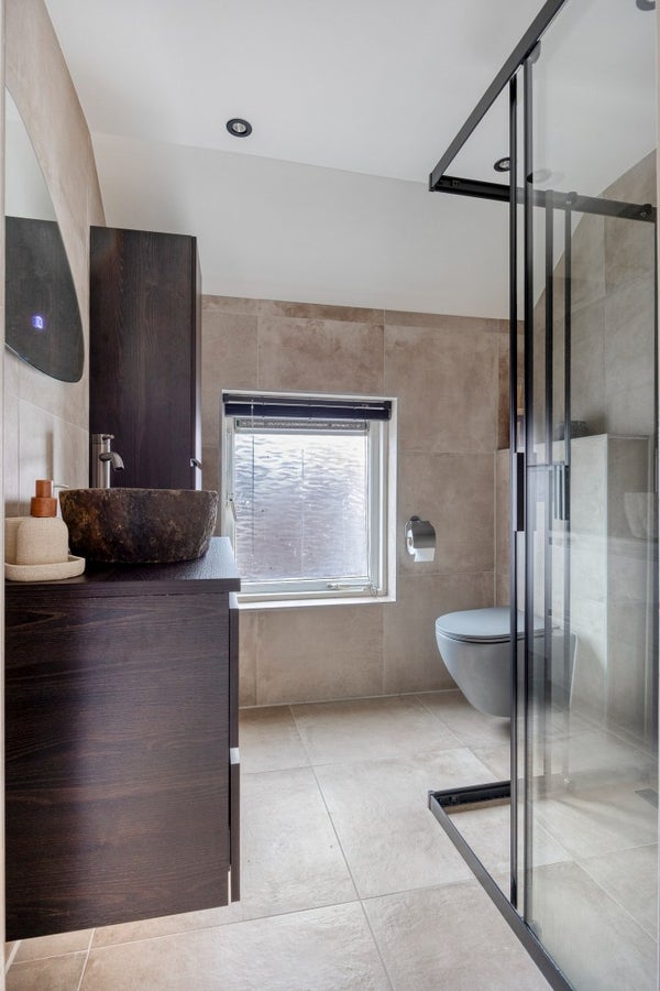 De nieuwe badkamer heeft vloerverwarming en is ingedeeld met een douche, tweede toilet, een wastafelmeubel en kastruimte.