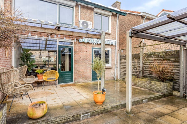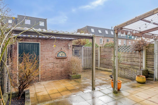 Aan de stenen berging is een overkapping gebouwd, die ook als terras gebruikt kan worden. Onder deze overkapping is een poort naar de steeg.