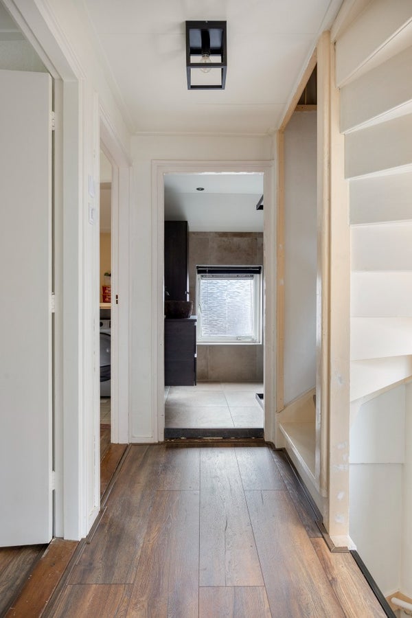 Vanaf de overloop zijn drie slaapkamers, de wasruimte en de moderne badkamer (2025) te bereiken. Op bijna de hele verdieping ligt laminaat