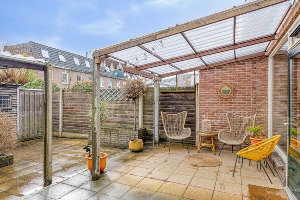 Vanuit de woonkamer en keuken is de achtertuin op het zuidoosten te bereiken. Het overdekte terras is een gezellige plek om te zitten en is er een dubbele berging