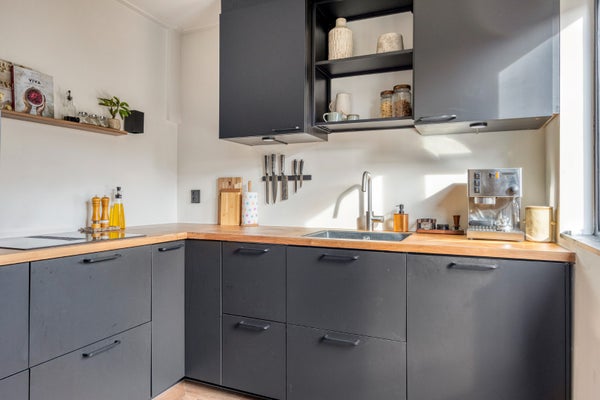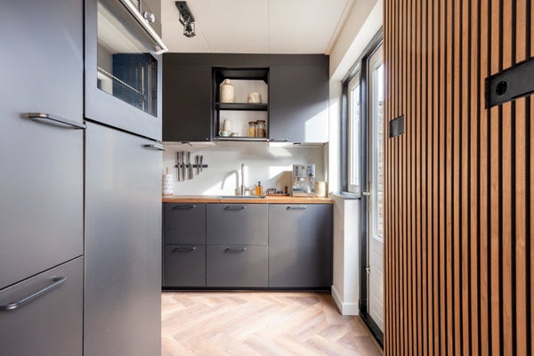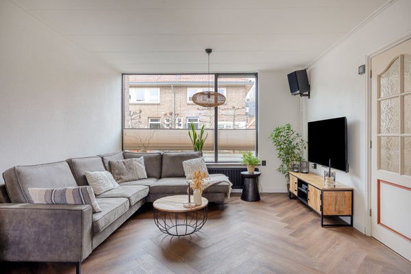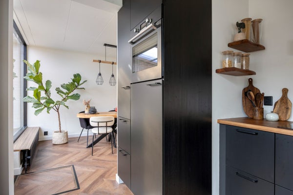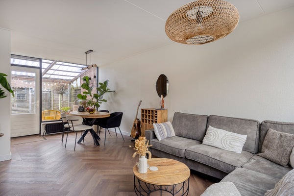 De woonkamer heeft grote ramen aan de voor- en achterzijde, een deur naar het overdekte terras in de achtertuin en een nieuwe PVC vloer. Aan de voorzijde is het zitgedeelte en het eetgedeelte grenst aan de keuken. De moderne open keuken is van 2024 en heeft een hoekopstelling met een inductie kookplaat met geïntegreerde afzuiging, vaatwasser, oven en inbouwkoelkast