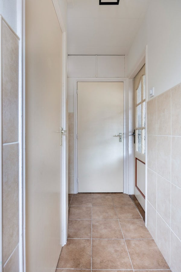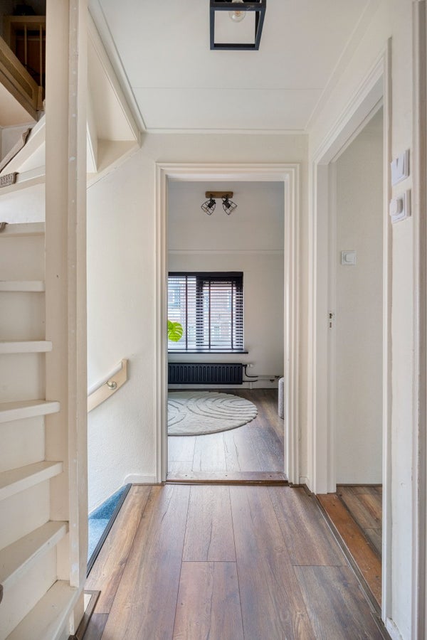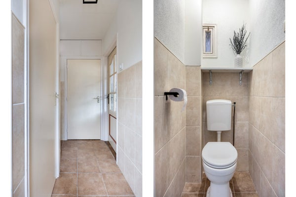 Begane grond: Links in de hal zie je een garderobenis, het toilet, een lichte tegelvloer en de trap naar de eerste verdieping. Doordat de deur naar de keuken is verwijderd, is de bergkast onder de trap een stuk groter geworden.