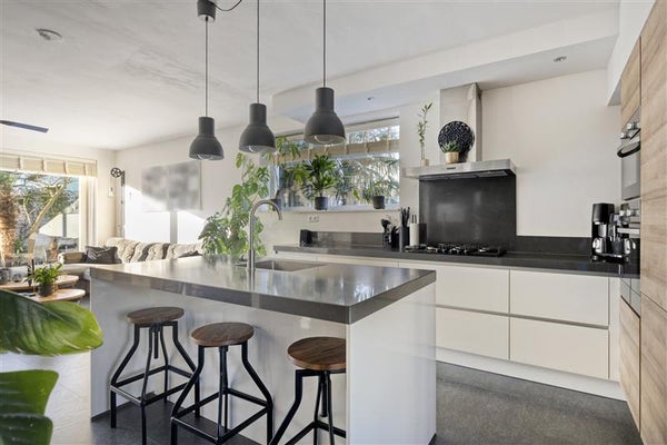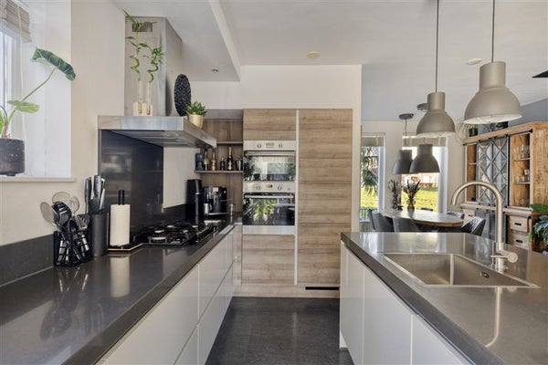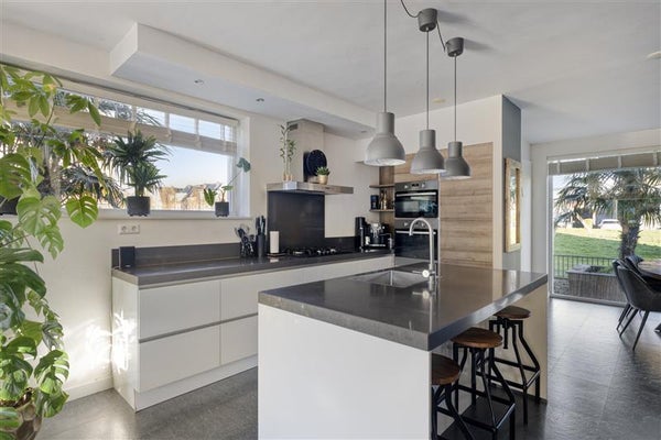 De eetkamer aan de voorzijde van de woning is dé plek om samen te genieten van een uitgebreid ontbijt of een gezellig diner. De stijlvolle keuken, voorzien van een ruim kookeiland, nodigt uit tot creativiteit. Of je nu een snelle maaltijd voor twee maakt of een culinair spektakel bereidt, deze keuken maakt koken een feest. Strakke lijnen, hoogwaardige materialen en alle moderne apparatuur die je je kunt wensen, maken dit een droomkeuken voor iedere (hobby)kok. Kers op de taart? Vanaf hier heb je een heerlijke verbinding met de tuingerichte woonkamer.