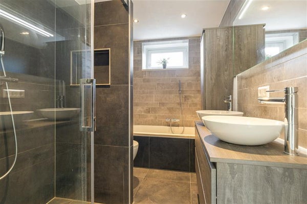 De bovenverdiepingen zijn al even indrukwekkend. Op de eerste etage vind je drie fijne slaapkamers. Deze ruimtes bieden volop mogelijkheden: van knusse kinderkamers tot een stijlvolle werkplek of logeerkamer. En dan is er nog de luxe badkamer! Fris, modern en uitgerust met een inloopdouche, een bad én een dubbel wastafelmeubel – hier begin je de dag in stijl.